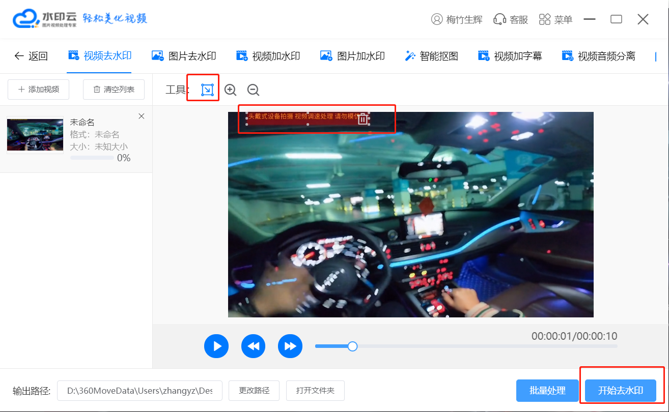 4、点击我们添加的视频文件,然后点击下面图片中的矩形工具。框选要去水印的地方,最后点击“开始去水印”。