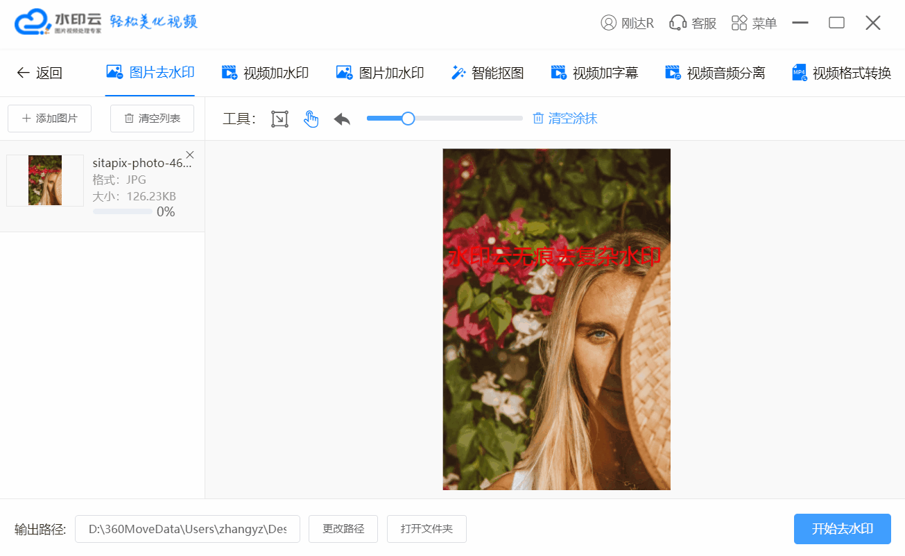 只需要选择图片去水印功能,涂抹水印区域,再点击开始去水印按钮,水印就成功去除了!下面是水印云电脑版的操作界面,手机也是同样原理。