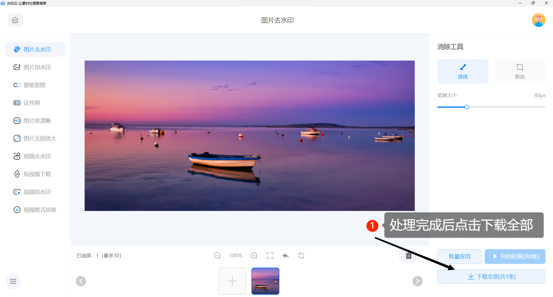 第四步:等待进度条至100%,系统处理完成后,直到效果满意后点击【下载文件】即可,如果是复杂,顽固的水印还可以无损放大后精细化多次涂抹消除。