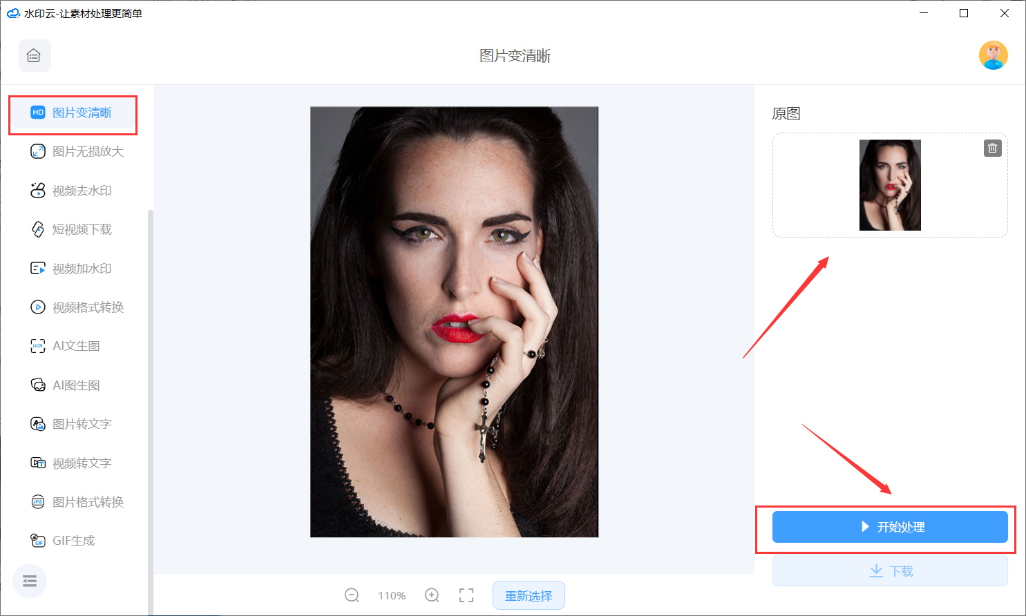 一个AI一键处理模糊图片变清晰工具,不需要你过多的操作只需要上传我们需要模糊图片变清晰的图就可以了,打开之后就可以选择我们的模糊变清晰工具,上传图片之后,它会自动进行处理,处理完成后可以看到原图和图像增强后的对比,点击下载按钮将图片下载到本地就好了。