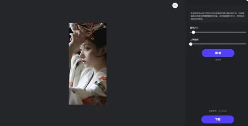 一个AI去水印在线工具,操作方法为:上传图片,在右侧调整画笔尺寸和上漆轻度,在有水印的位置进行涂抹,然后点击擦除,处理完成之后点击下载进行保存。