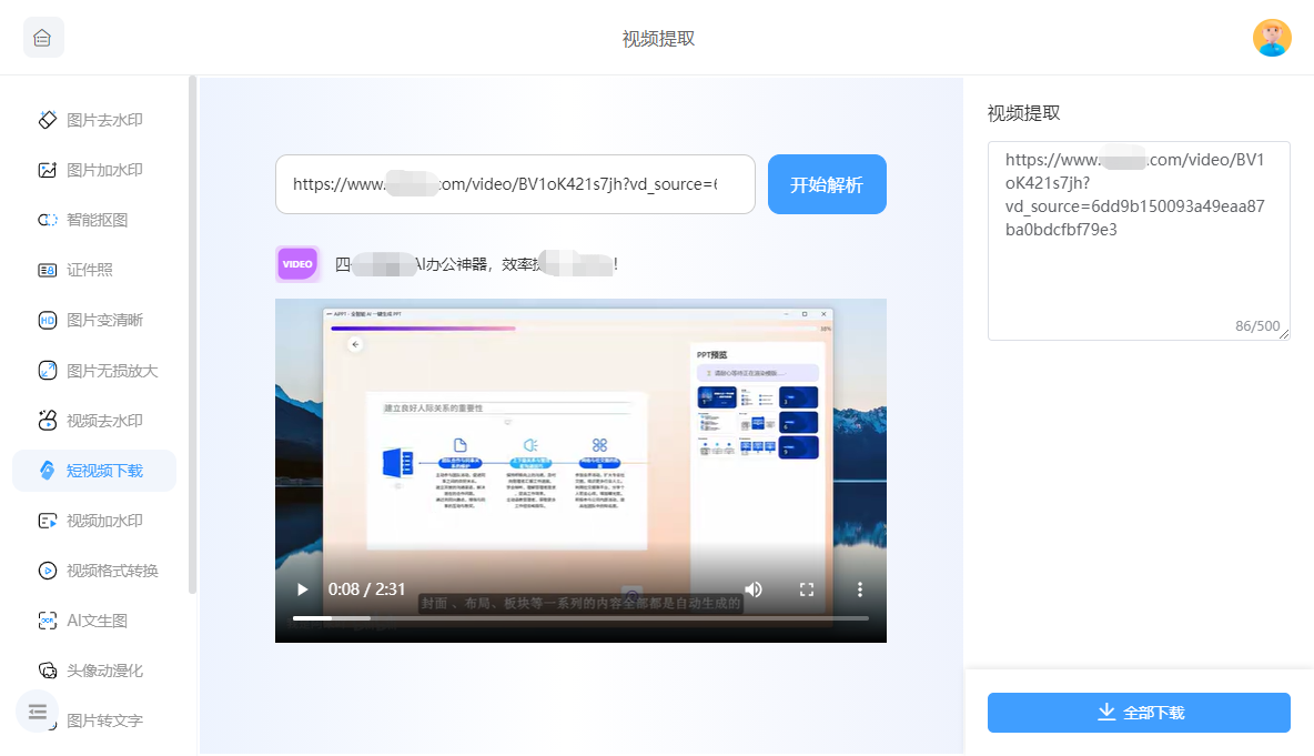 复制上传想要下载的视频链接,经处理后保存即可