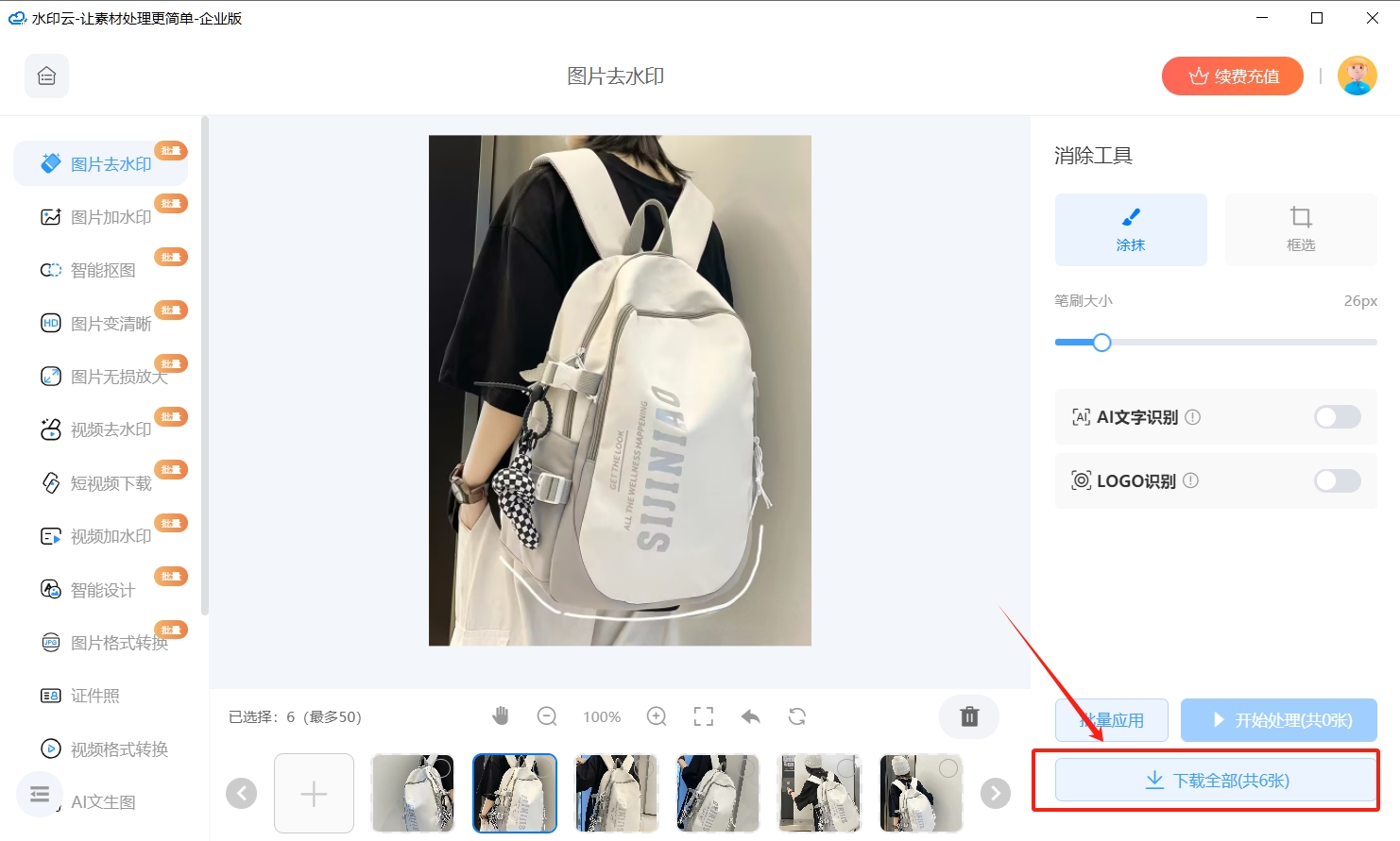 2、根据水印类型选择合适的去水印模式,如涂抹模式。在图片中涂抹出需去除的水印区域,可多选并应用至全部,点击“开始处理”。