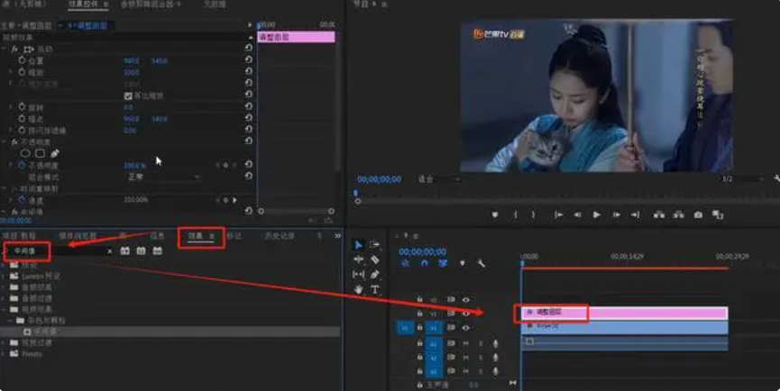 在【效果】面板中找到【中间值】,拖到调整图层上。