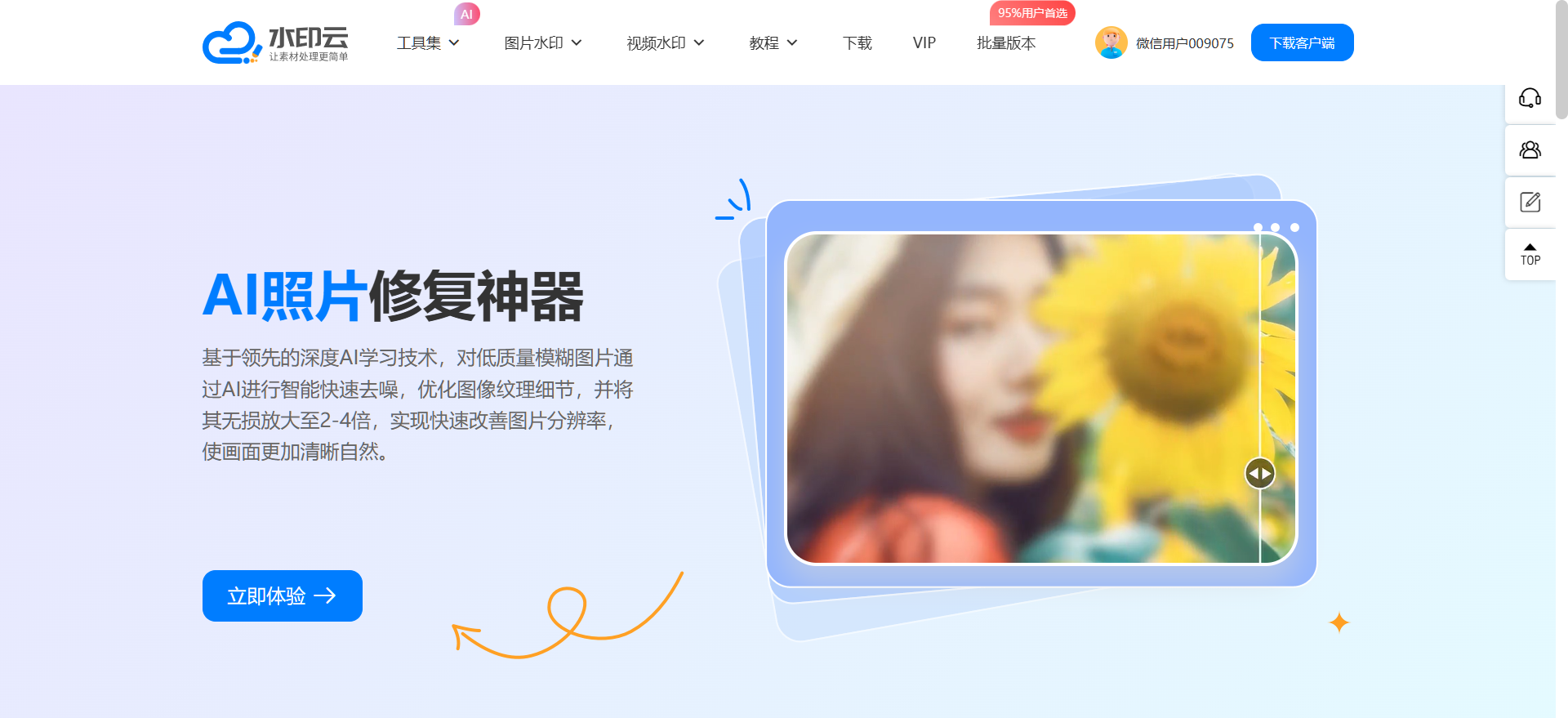 水印云是一款集成了先进AI技术的在线图片处理神器,其“图片变清晰”功能尤为出色。只需简单几步,即可让模糊图片重获新生: