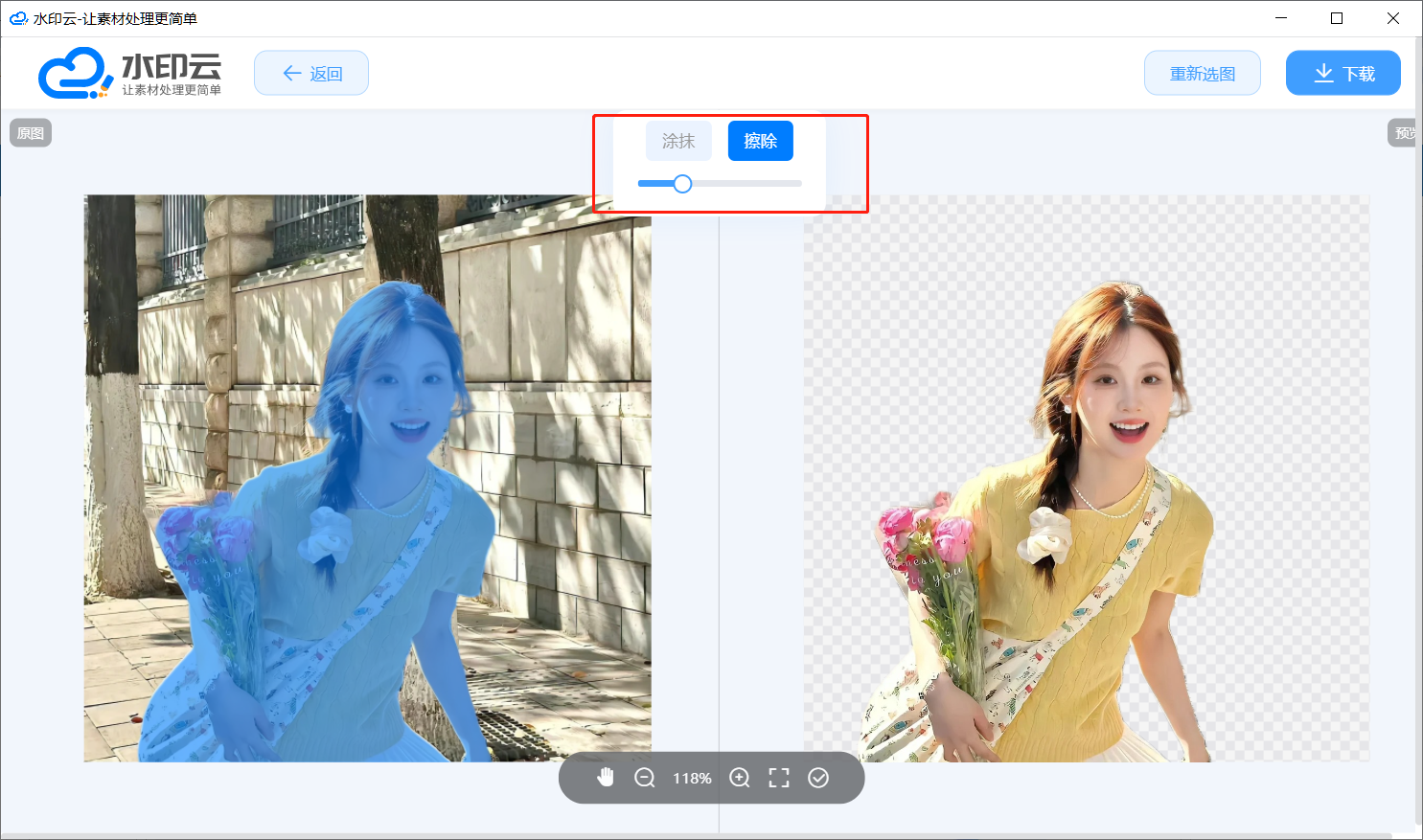 3、还可以点击手动抠图里的涂抹和擦除功能,对抠图效果进行微调,完成后点击“返回”按钮。