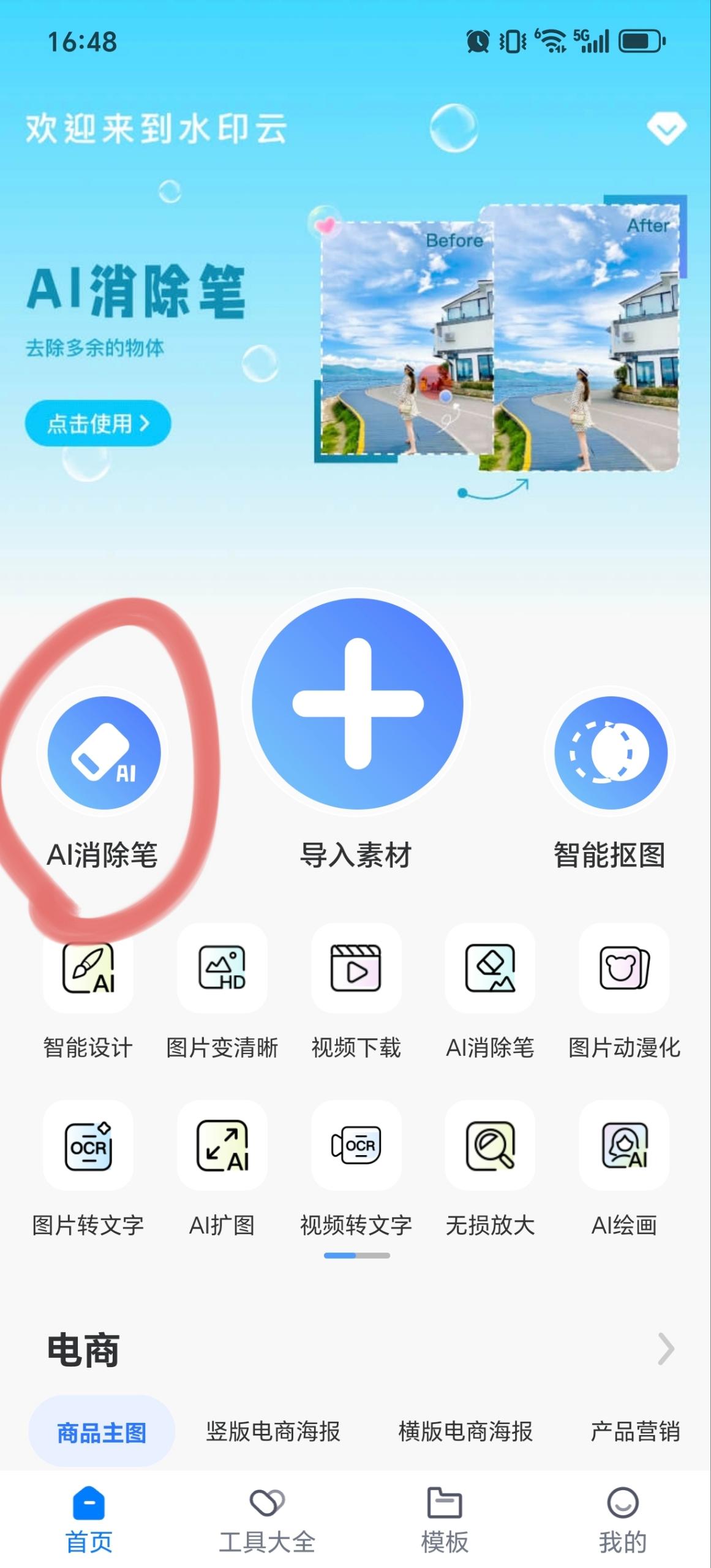 2、在工具栏中找到“去水印”功能,使用鼠标在图片上涂抹水印区域,点击“去除水印”按钮,等待处理完成。