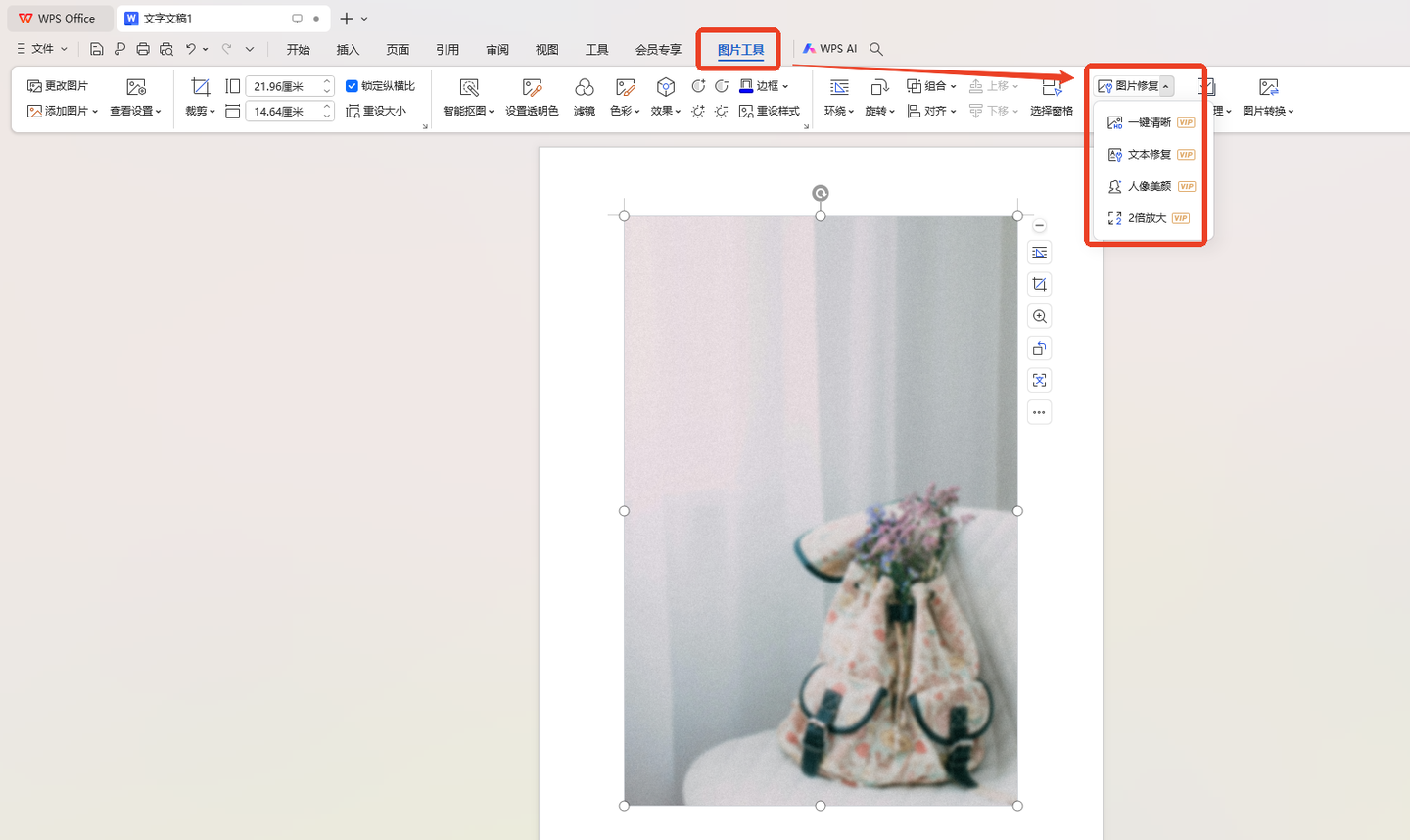 2、点击图片,在“图片工具”栏下选择“图片修复”功能。