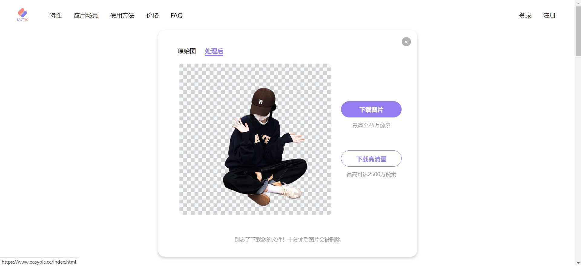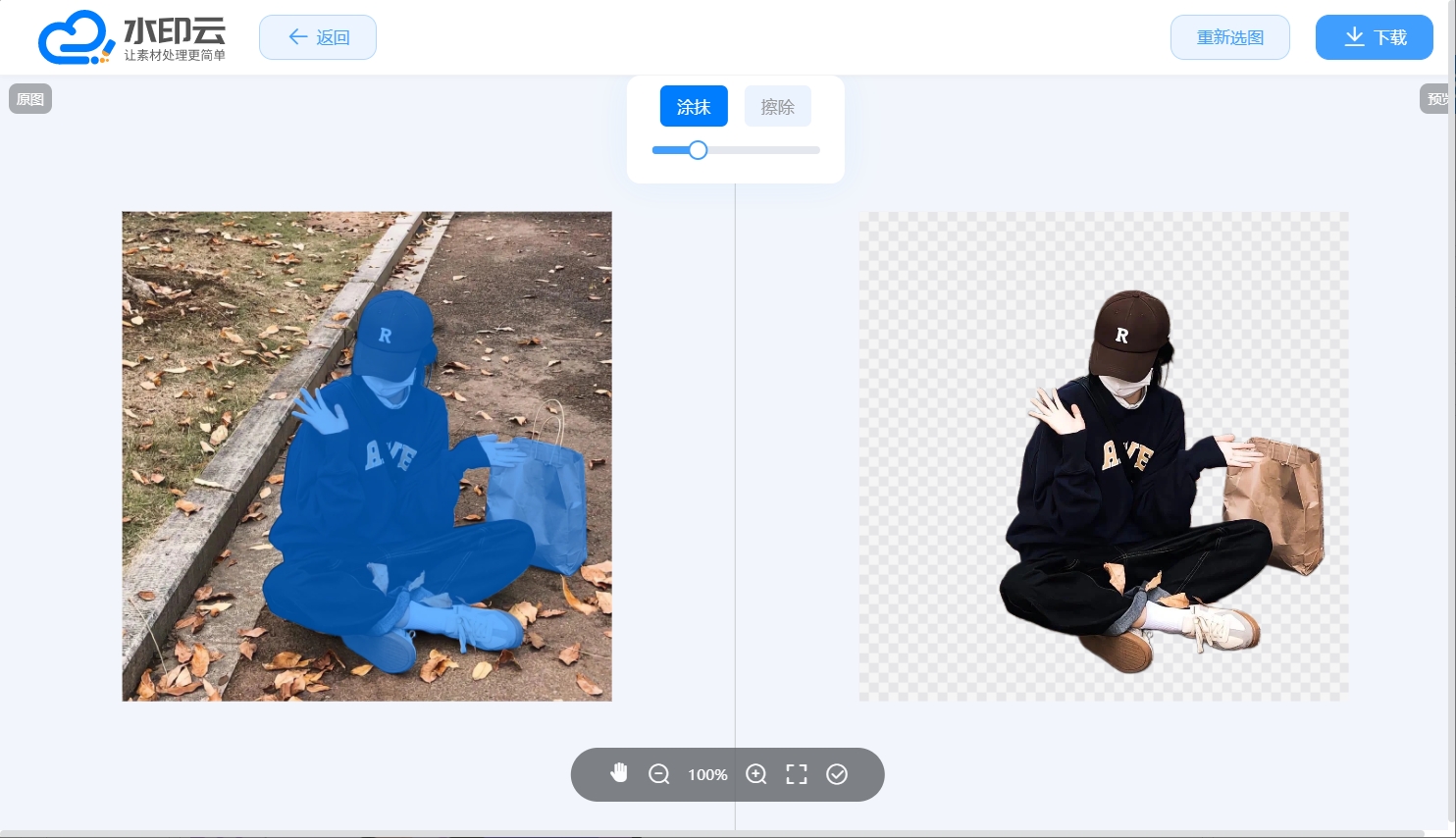 2、工具自动识别并抠出前景,可以在当前界面直观看到抠图前后对比效果。