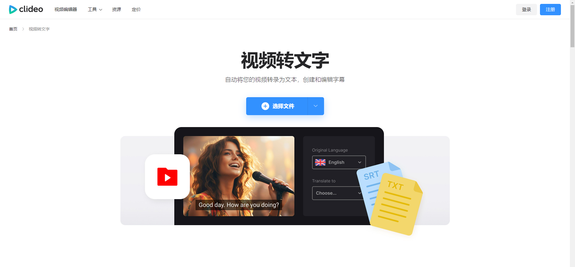 3、点击 “Choose file”(选择文件)按钮,从本地选择需要提取文字的视频文件进行上传。也可以通过粘贴视频链接的方式导入视频。