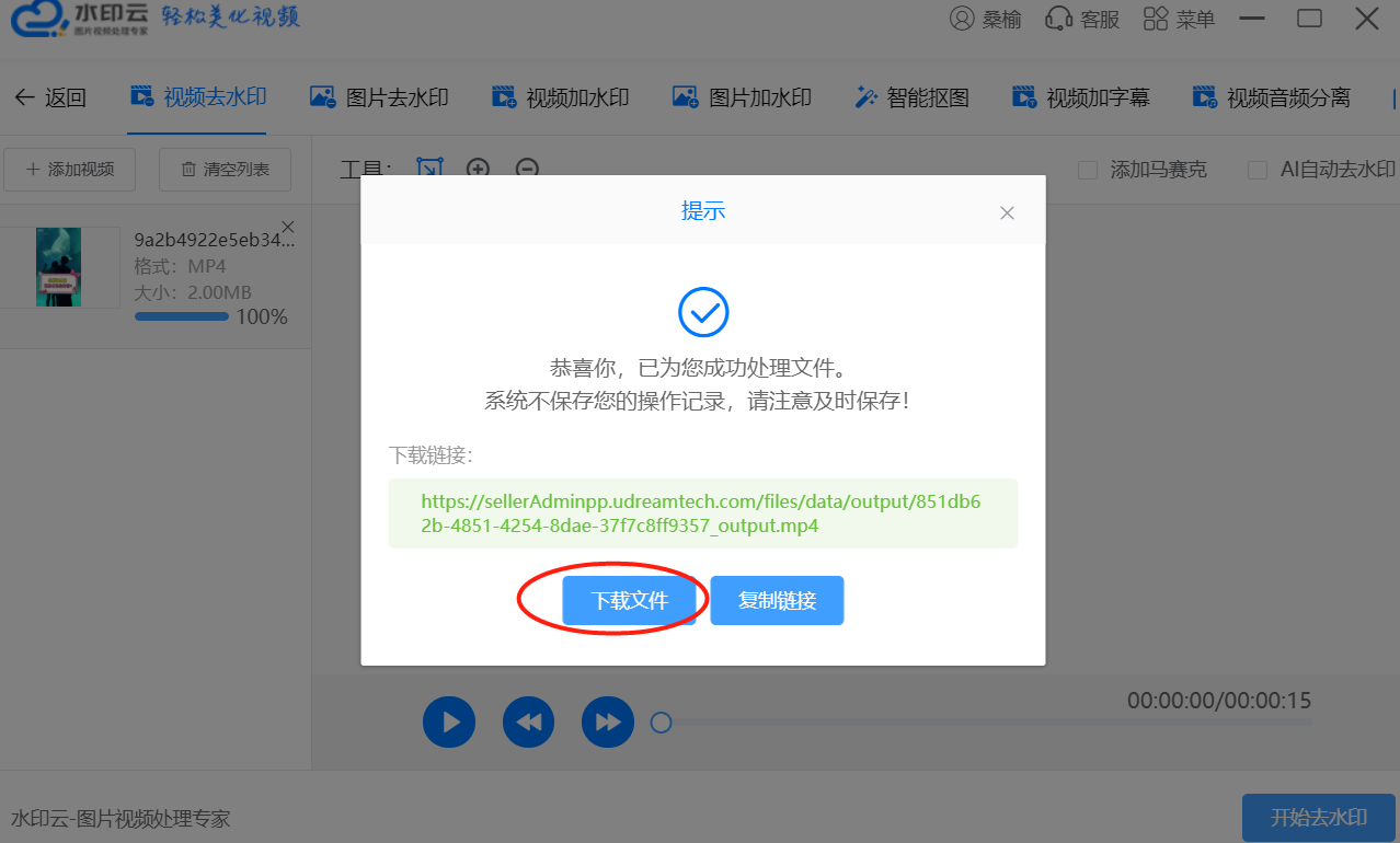 4、一键去水印后,【下载文件】保存即可。